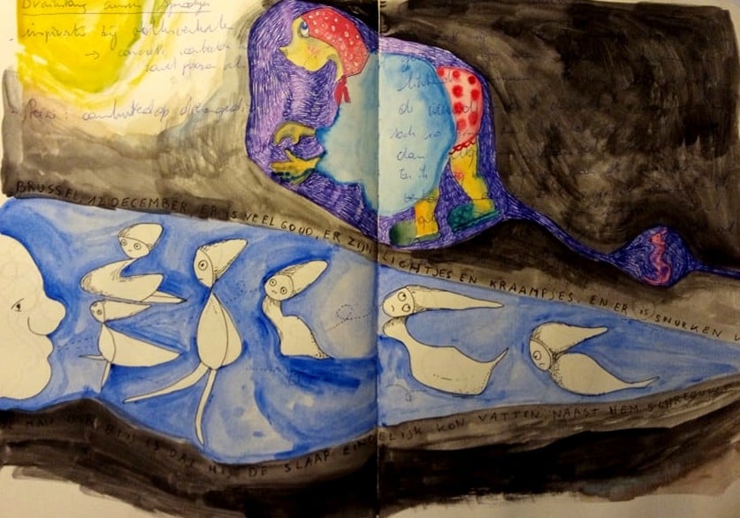 Eigenlijk waren die schetsboeken toen een grote bron van inspiratie, ik putte er gedichten, verhalen, illustraties, filmpjes en muziek uit.