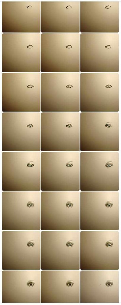 Of je nu tekent, knipt, met klei werkt of digitaal animeert, er ontstaat een verrassingseffect wanneer je vormen voor de ogen van de kijker laat ontstaan. Dat doe je door gedurende het hele proces van maken na elke kleine verandering een nieuwe foto te maken. Wil je het ontstaan van een oog weergeven, dan zal het verloop van je foto’s er ongeveer zo gaan uitzien: